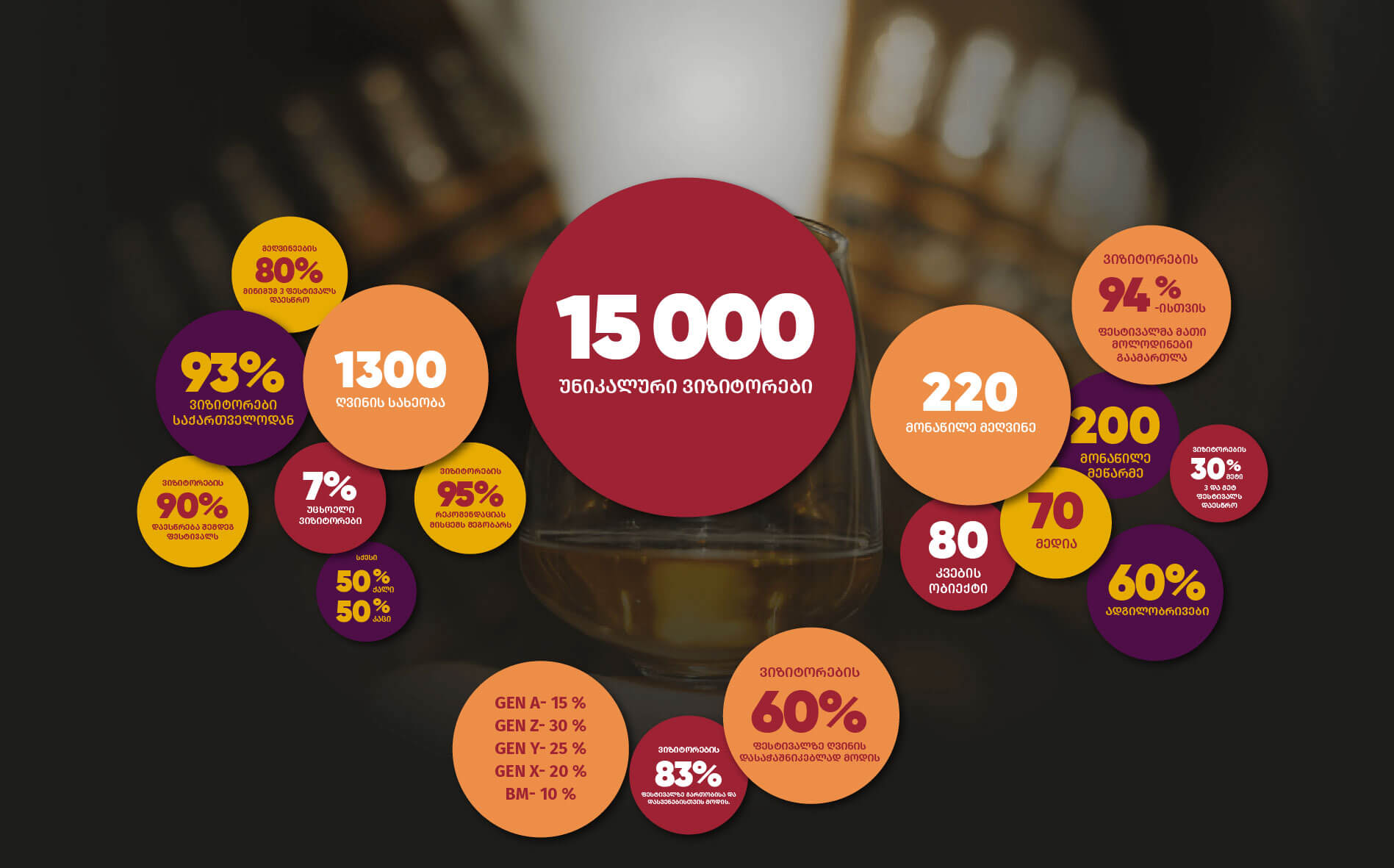 მასშტაბურობა და მრავალფეროვნება: ფესტივალზე წარმოდგენილია 1300-ზე მეტი სხვადასხვა ტიპის, ფერისა და ასაკის ღვინო, ჭაჭა და სხვა სასმელები.